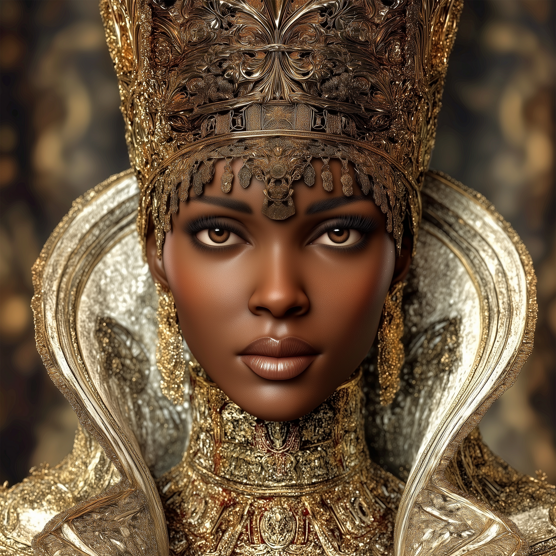 She stands adorned in gilded armor fit for a celestial queen, every detail carved with ancestral symbolism and breathtaking craftsmanship. Her crown rises like a monument, shimmering with warmth, wisdom, and sacred lineage. The gold tones surrounding her are not merely decorative; they feel earned, inherited, and deeply spiritual, as though passed through generations of royalty.