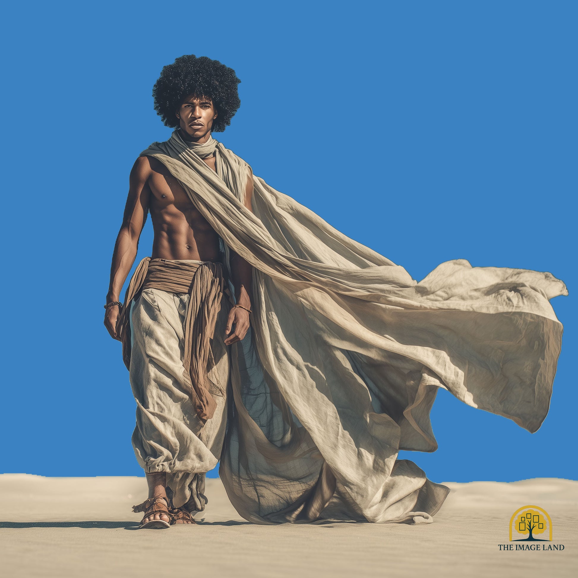 Karameli embodies strength, serenity, and timeless masculine beauty. Draped in flowing earth-toned fabric that moves like desert wind, he stands with the confident ease of a man deeply connected to nature, ancestry, and purpose.