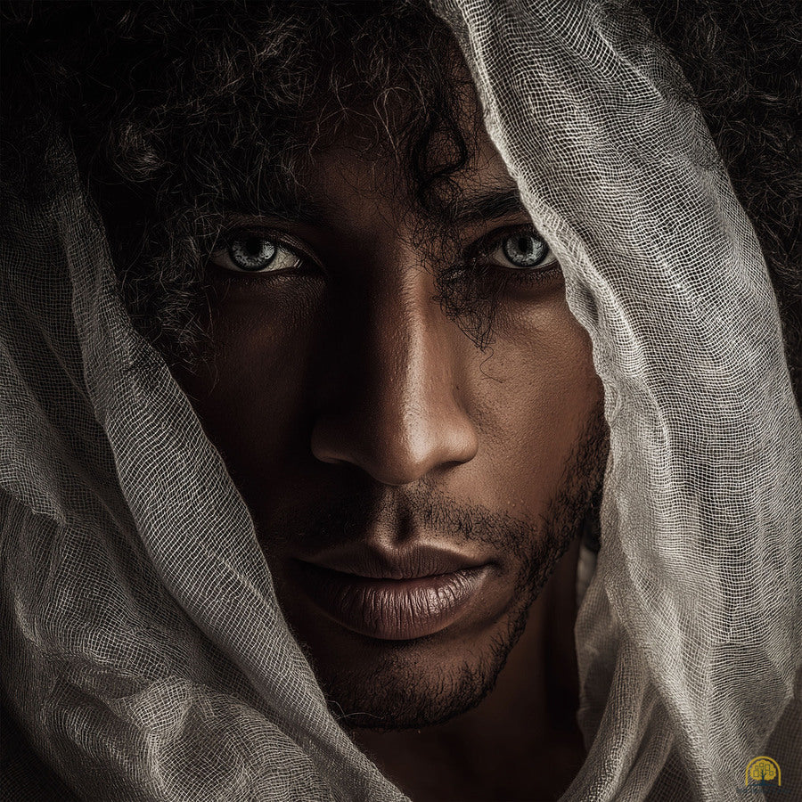 Kijani is a portrait of depth, mystery, and quiet spiritual intensity. His piercing eyes, almost luminous, draw you into a moment suspended between shadow and revelation. Wrapped in soft, gauzy fabric, he appears both protected and exposed, reflecting the duality of vulnerability and strength.
