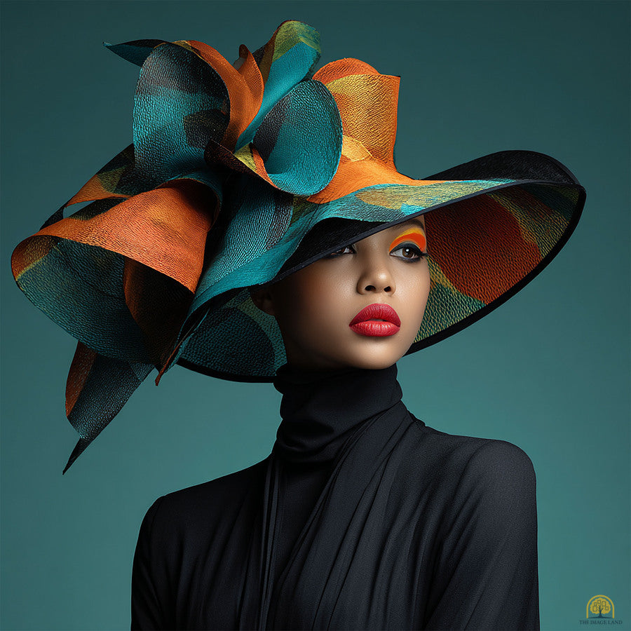 Above her, an extraordinary hat rises like a living sculpture. Teal, amber, and golden light move across its surface, creating the impression of layered petals or drifting shapes caught in midair. The piece feels alive, as if responding to her spirit rather than the air around her.