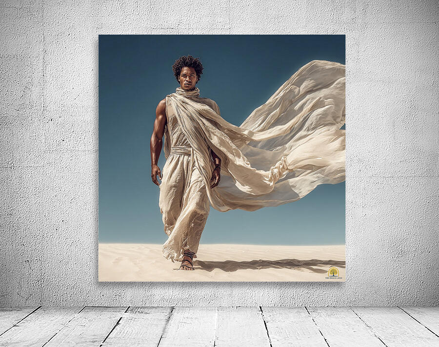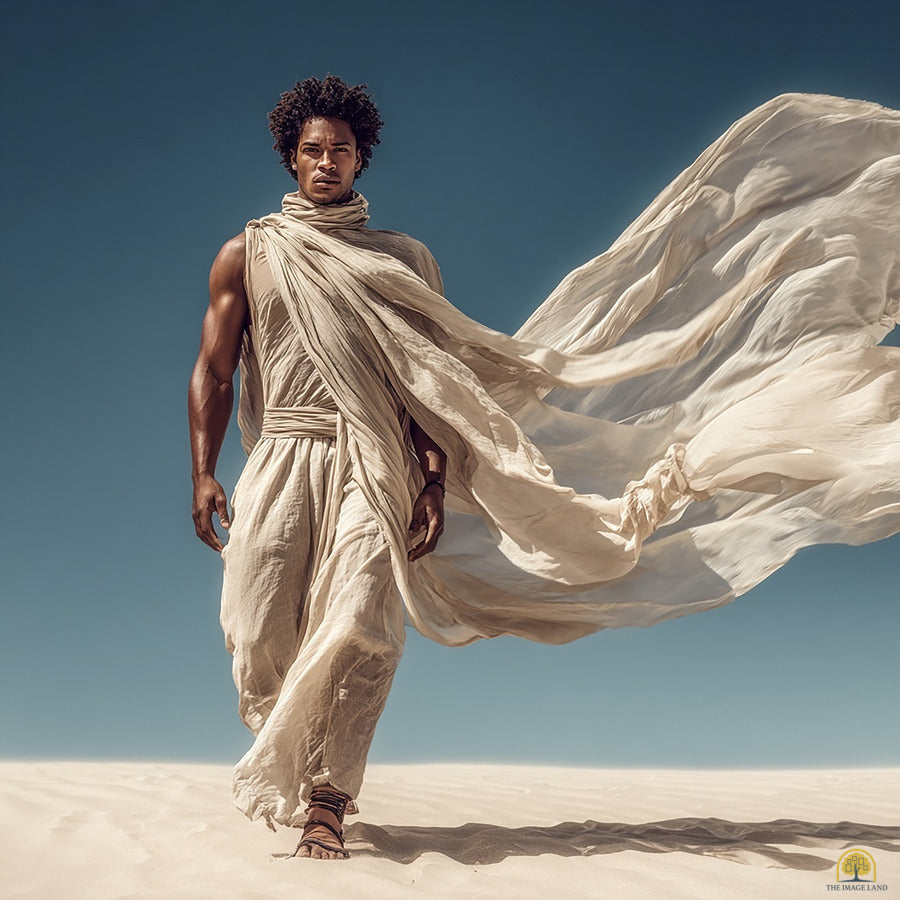 Amadeus is a striking study of motion, strength, and purposeful elegance set against the endless sky. He strides forward wrapped in sweeping sand-toned textiles, the fabric catching the wind as though alive with its own energy. The sunlight shapes his physique with sculptural precision, revealing both physical power and a deeper sense of resilience.